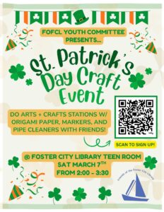Join us on March 7 at 2:00 PM in the Teen Room for a festive St. Patrick’s Day Craft Event hosted by the FOFCL – Youth Committee.